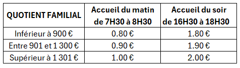 Les tarifs de l’accueil périscolaire du matin et du soir sont fixés en fonction du quotient familial.