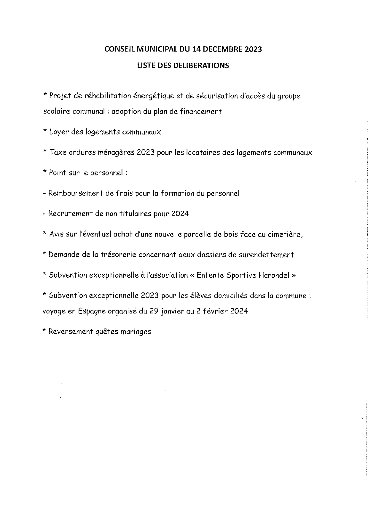Liste des délibérations du 14/12/2023