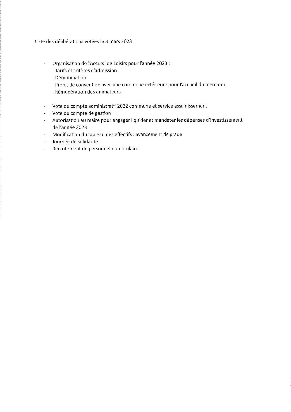 Liste des délibérations du 03/03/2023
