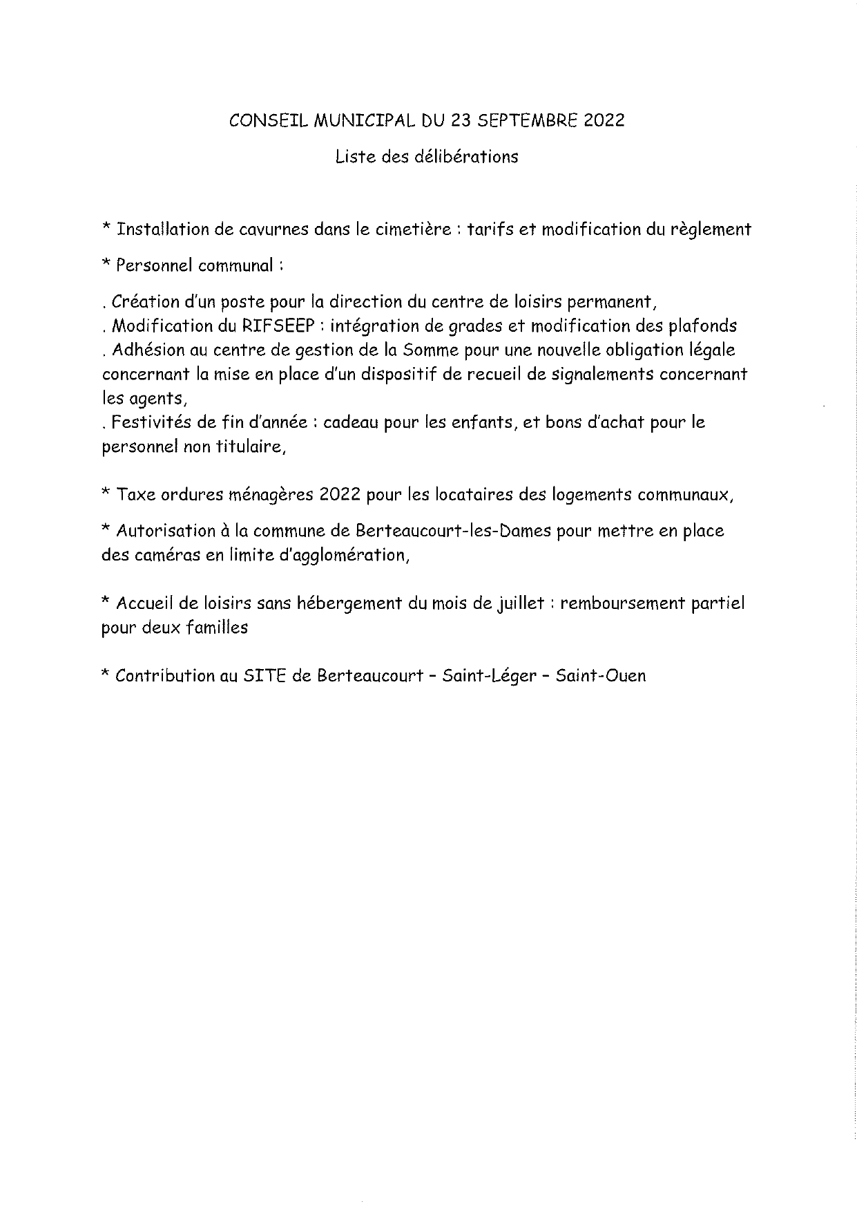 Liste des délibérations du 23/09/2022